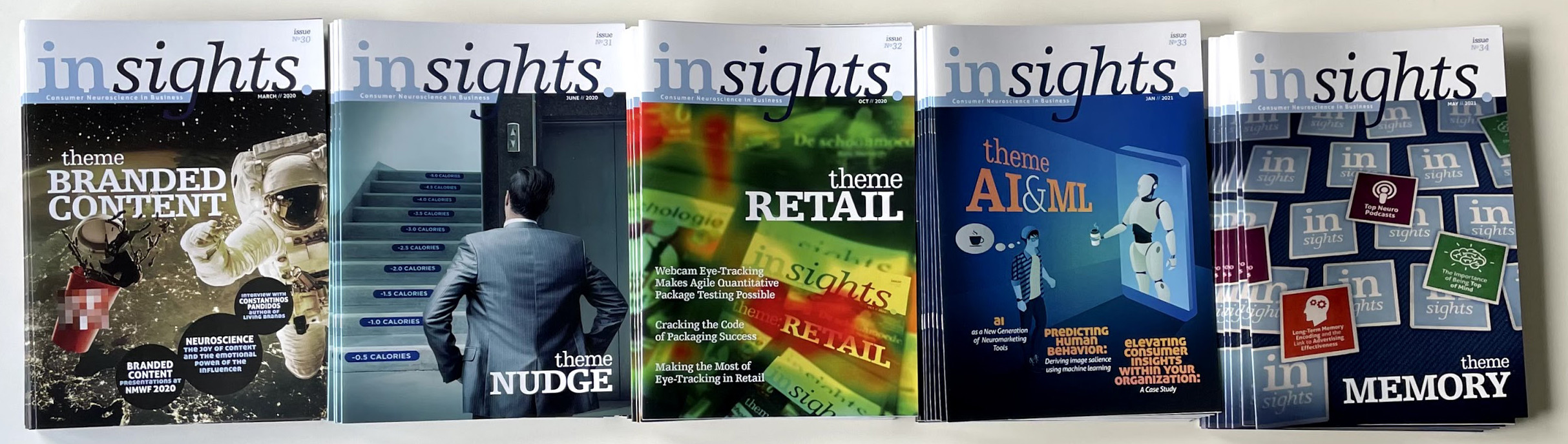 Insights is the world’s only publication on consumer neuroscience applied in business. Solid scientific principles and methodologies, applied to real business scenarios. In each issue, leading neuroscientists and market researchers present the latest neuroscience findings and help readers address pressing marketing challenges. Each issue is focused on a theme, such as emotional marketing, online shopping, trust, and consumer senses.