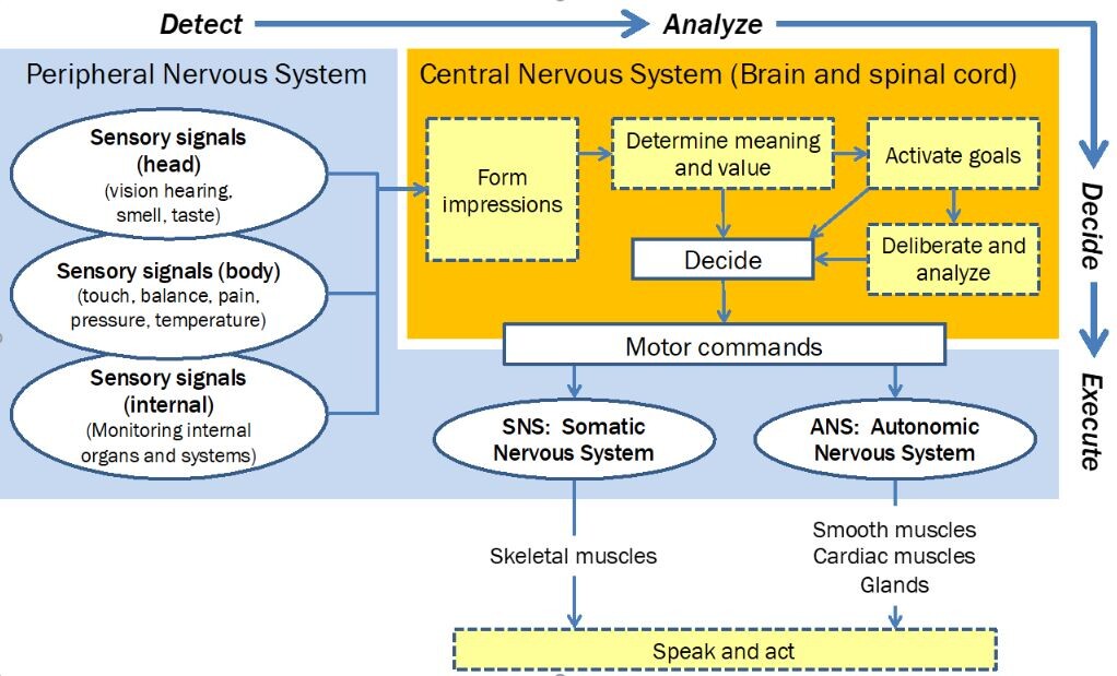 Neuroimaging technologies like EEG and fMRI capture CNS (Central Nervous System) activity inside the brain. Biometrics capture physical responses (muscle movements) directed by the brain through the PNS (Peripheral Nervous System). These physical actions are communicated through two subsystems within the PNS: the autonomic nervous system (ANS) and the somatic nervous system (SNS). Signals originating through the ANS impact “smooth” muscles, organs, and glands like the heart and stomach. They are relatively slow, mostly automatic, and produce body responses such as perspiration, heart rate, breathing, and pupil dilation. Signals originating through the SNS impact the skeletal muscle system, are much faster, and, importantly, are also under at least partial voluntary control. They include responses like facial expressions, eye movements, blinks, and physical actions like walking and talking. (Genco et al., 2013).