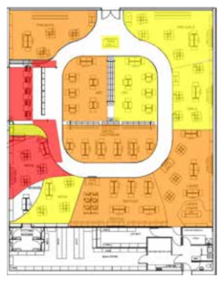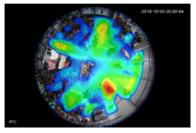 Customers’ behavioral responses were also coded by blind raters (who were not responsible for the rest of the data analysis) and matched post marking with both the biometric and eye-tracking data. Heat maps of the customers’ visual engagement with specific areas of the store were also produced (figure 3), and foot-traffic heat maps were also used (figure 4). For store zones in which customers spent significant amounts of time, GSR data in conjunction with eye-tracking data was used to compute emotional engagement levels and estimate cognitive load metrics.
