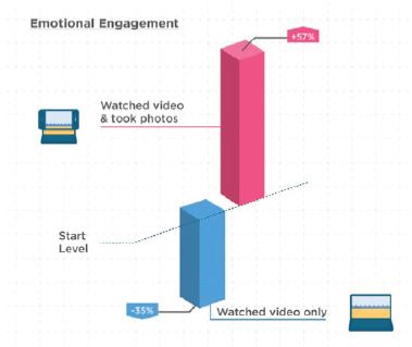 The EEG analysis generated two key metrics: emotional engagement and attentional activation. Emotional engagement was derived from left-right alpha asymmetry in the pre-frontal cortex, indicating changes in subjects’ emotional reactions. Greater relative activity in the left frontal region strongly correlates with approach motivations, including liking, wanting, motivating to action, purchase intent, and willingness to pay for something. Greater relative activity in the right frontal region correlates with withdrawal motivations, such as disliking, disgust, and avoidance behavior. The level of emotional engagement at each stage was measured as deviation from the total average level of engagement, across all subjects, across the whole experiment.