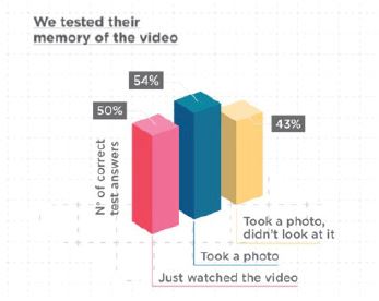 The primary finding of the study was that taking a photo with a smartphone while watching a video makes the experience more enjoyable. This was not surprising considering that most people are very attached to their phones. However, it was interesting to note that although the experience was more enjoyable for those subjects permitted to take photos, the performance on a memory test when the photo was not used to aid recall was worse than the group who used the photo. Among those participants who watched the videos without taking a photo, the level of emotional engagement was not very high, however, they performed much better on the memory task.