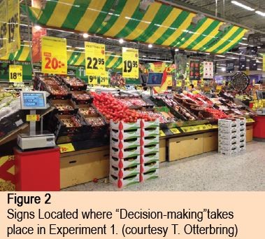 Experiment 1 investigated how store-familiar and store unfamiliar customers use in-store signs to navigate and make decisions. One hundred and one volunteer test subjects were recruited while shopping in a market that functioned as the experiment’s setting. Unbeknownst to test subjects, thirty in-store signs were installed for the experiment. Half provided navigational clues, such as advertisements or information regarding nearby goods (figure 1).