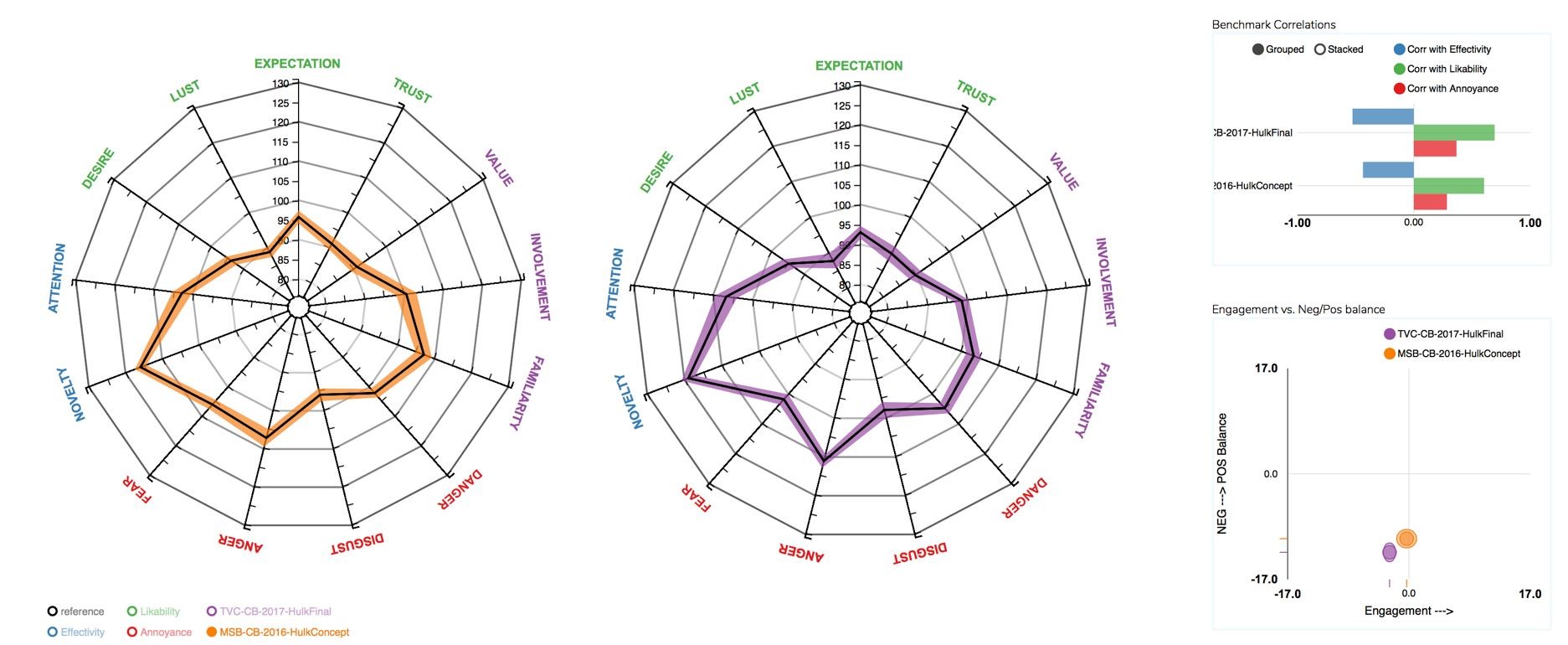 The example illustrates the principle of analysis. Both storyboard and TV commercials evoke fairly similar (but not identical) mapper values. Note for example, how negative emotions are generally higher than positive emotions. This similarity can be expressed in the correlation value, which in this case is 0.76. A value of 1.0 would indicate perfect similarity.
