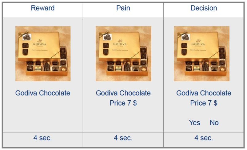 In a ground-breaking experiment (see figure 1), neuroscientist Brian Knutson, Professor at Stanford University, and his colleagues (2007) wanted to find out if it was possible to predict purchase behavior by analyzing neural activity. His research began with images of products and brands undefined for example a box of chocolates undefined shown for a few seconds. Then, additionally, the price appeared on the screen, and finally the respondents had to state, by pushing a button, whether they would buy the chocolates or not.