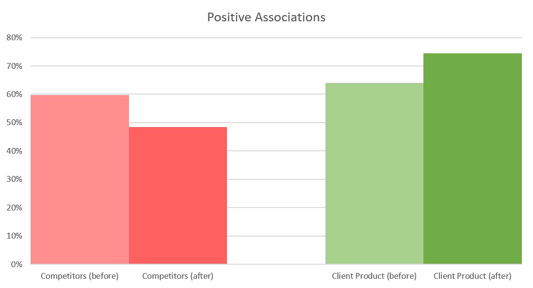 Overall positive associations for the product increased by 10%, whilst competitors on average dropped by 12%. Positive brand attributes increased across the board for the client and decreased for all competitor products.
