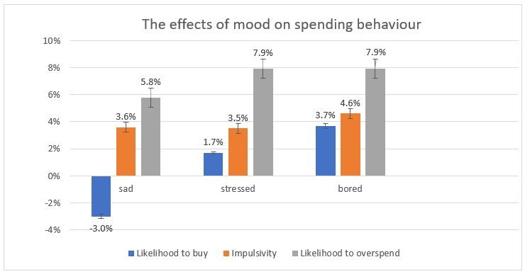 Our overall findings showed that sadness, stress and boredom caused significant changes in spending behavior. Compared with the control group, people who were sad, stressed or bored were, on average, 7% more likely to overspend and 4% more impulsive when making purchase decisions. We found that boredom was a major driver of spending. People who were bored were 5% more likely to buy products. People were the least likely to buy when sad.