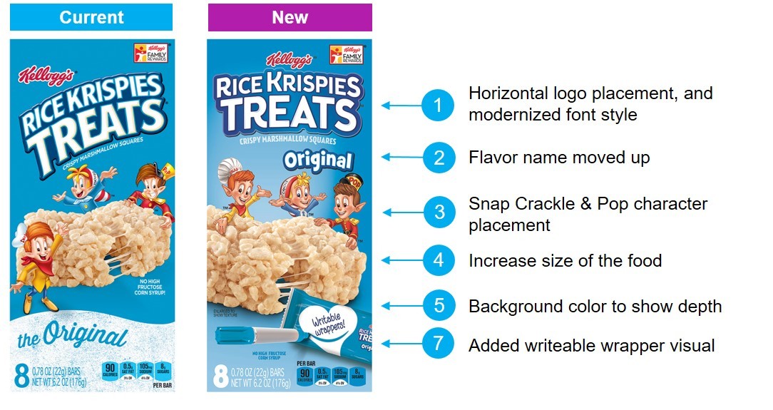 Kellogg made several changes to the Rice Krispies Treat package design, including orientation and font style of their logo, refreshing the Snap! Crackle! Pop! iconic characters, placement of the variety/flavor description, background color, and an increase in the image size of the food. Kellogg’s package redesign would extend to all sizes of the Original flavor, creating a more consistent blue brand block that extends to the bottom shelf.