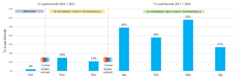 Figure 3: Percentage lead growth increase monthon-month: comparing the market response to the Breathe TVCs with the subsequent client testimonial TVCs incorporating the Neuro-Insight executional recommendations.