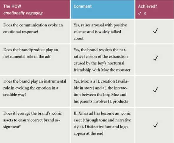Emotional communication is an effective vehicle, but it is not the message. To impact behavior, we need a message that increases the perceived goal value of our brand, a message that shows that the brand is instrumental in helping us achieve our goals. To increase the impact of communication, the power of emotional response should be leveraged in order to optimize attention, recall and increase the likelihood of sharing. Let’s look at some key points on how to achieve this, using the John Lewis “Moz the Monster” Xmas TVC (2017). The table below summarizes the motivational (the WHAT) and the emotional (the HOW) dimensions of the ad.